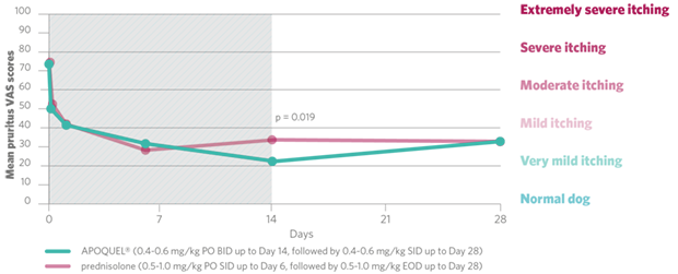 PRURITUS ASSESSED BY PET OWNER In a randomised, double-blinded study, 123 client owned dogs with moderate to severe pruritus were treated with APOQUEL® (n=61) or oral prednisolone (n=62). Dogs had a presumptive diagnosis of flea, food, or contact allergy, or atopic dermatitis. Severity of pruritus (VAS score) were assessed by pet owners before and during the one month treatment.2