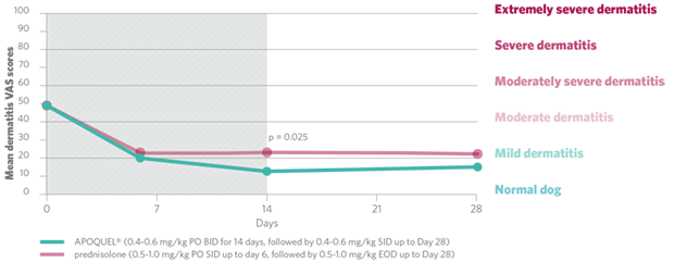 SKIN LESIONS ASSESSED BY VETERINARY SURGEONS In a randomised, double-blinded study, 123 client-owned dogs with moderate to severe pruritus were treated with APOQUEL® (n=61) or oral prednisolone (n=62). Dogs had a presumptive diagnosis of flea, food, or contact allergy, or atopic dermatitis. Severity of skin lesions (VAS dermatitis) assessed by veterinary surgeons before and during the one month treatment.2